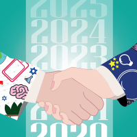 Чтобы проиллюстрировать сотрудничество между Израилем и Европейским Союзом, она решила нарисовать две руки - одна с "маген-давидом", другая - со звездами, символизирующими ЕС. Руки украшены элементами, традиционно связанными с исследованиями и инновациями - увеличительное стекло, мозг, пробирки, компьютер. Цифры на заднем плане должны подчеркнуть, что речь идет о долгосрочном сотрудничестве.